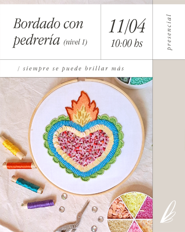 En este workshop vas a aprender a bordar con pedrería: lentejuelas, mostacillas, canutillos y otros materiales que suman textura, brillo y un toque de lujo a cualquier proyecto.